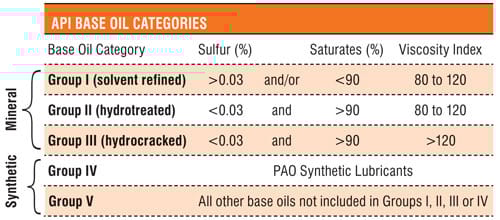 Before we dive into the pricing mystery, let's quickly cover the basics. There are (5) general categories defined by API 1509 Annex E [4] for base stocks. A “base stock” is the primary constituent of engine oil. These 5 base stock categories are defined based on their saturate content, sulfur content, and viscosity index as seen in the chart below: