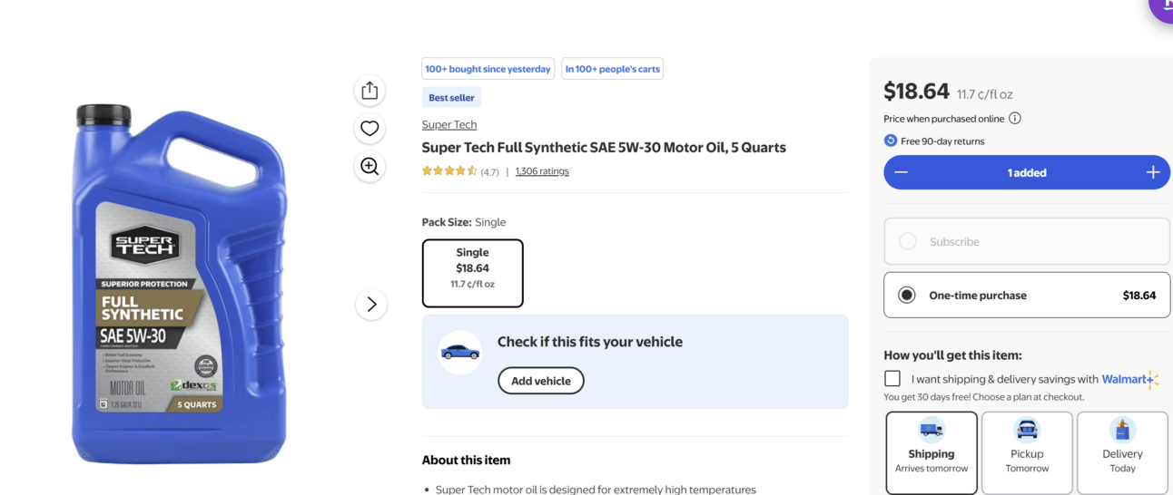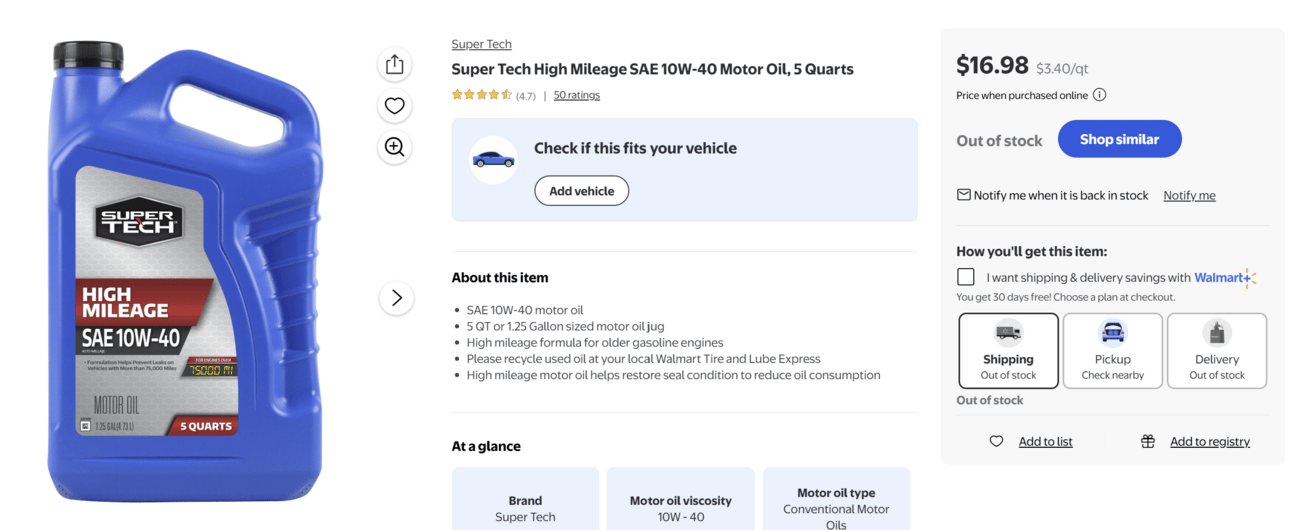 ![]() Super Tech Conventional Motor Oil $16.98 | ![]() Super Tech Full Synthetic Motor Oil $18.64 |